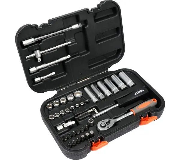 Zestaw narzędziowy STHOR składa się z 42 elementów umieszczonych w wygodnej walizce z tworzywa sztucznego. Narzędzia zostały precyzyjnie wykonane z materiałów zapewniających ich niezawodność. W zestawie znajdziemy pełen zakres nasadek 1/4", przedłużki, przegub Cardana i wiele innych elementów, włącznie z grzechotką o 45 zębach. Taka konfiguracja sprawia, że zestaw znajdzie zastosowanie przy drobniejszych pracach montażowych, przy naprawach mechanicznych oraz wielu innych pracach w gospodarstwie domowym czy warsztacie.- nasadki krótkie 1/4": 4; 4.5; 5; 5.5; 6; 7; 8; 9; 10; 11; 12; 13; 14mm- nasadki długie 1/4"": 8; 9; 10; 11; 12; 13 mm- przedłużki 1/4" x 2- przedłużka elastyczna 1/4"- grzechotka 1/4" 45T- pokrętło wkrętakowe 1/4"- pokrętło przesuwne 1/4"- przegub Cardana 1/4"- adapter do końcówek- końcówki wkrętakowe krzyżowe Philips: Ph0; Ph1; Ph2- końcówki wkrętakowe krzyżowe Pozidriv: Pz0; Pz1; Pz2- końcówki wkrętakowe płaskie: 3; 4; 5 mm- końcówki wkrętakowe sześciokątne: 6; 7; 8 mm- klucze imbusowe hex: 1.5; 2; 2.5 mm- walizka