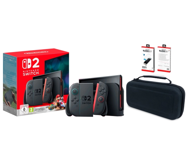 Konsola Nintendo Switch 2 Joy-Con Czarny + Mario Kart World + Etui Nacon Rigid Transport Case + Szkło Yaxo Glass Set