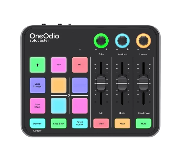 <h2>Mikser Audio i Karta dźwiękowa OneOdio Solocaster</h2><p>OneOdio Solocaster to mikser audio USB (Universal Serial Bus, uniwersalne złącze do przesyłania danych i zasilania) do streamingu i nagrań, który umożliwia miksowanie wielu źródeł jednocześnie. Oferuje funkcję Loopback, redukcję szumów w czasie rzeczywistym oraz wbudowane efekty głosowe. Sterowanie odbywa się za pomocą suwaków i padów FX (Effects, efekty dźwiękowe), bez potrzeby instalowania dodatkowego oprogramowania. Podświetlenie RGB (Red Green Blue, technologia podświetlenia wykorzystująca trzy kolory do tworzenia różnych barw) ułatwia obsługę i nadaje stanowisku nowoczesny charakter.</p><h2>Pięć wejść i szeroka łączność</h2><p>Urządzenie wyposażono w pięć równoległych wejść, w tym port USB-C (Universal Serial Bus typu C, uniwersalne złącze do przesyłania danych i zasilania), który działa jako interfejs audio dla komputera, smartfona lub tabletu. Gniazdo XLR (standard złącza audio stosowany w profesjonalnym sprzęcie nagłośnieniowym) z zasilaniem phantom 48 V (woltów) obsługuje mikrofony pojemnościowe, a wejście 3,5 mm o podwyższonej impedancji pozwala podłączyć gitarę lub klawiaturę. Dostępne jest również wyjście słuchawkowe 3,5 mm do monitoringu. Łączność Bluetooth (bezprzewodowa technologia komunikacji krótkiego zasięgu) umożliwia bezprzewodowe dodanie podkładu muzycznego z urządzeń mobilnych.</p><h2>Kompatybilność z wieloma platformami</h2><p>Solocaster współpracuje z 99,99% aplikacji do streamingu i karaoke, w tym TikTok, Bilibili i Kwai. Obsługuje 99,99% mikrofonów pojemnościowych z zasilaniem phantom 48 V. Bez problemu łączy się także z konsolami PS4 (PlayStation 4, konsola do gier firmy Sony) i PS5 (PlayStation 5, konsola do gier firmy Sony). Może pełnić funkcję centralnego interfejsu audio dla komputera, laptopa, smartfona, tabletu i konsoli.</p><h2>Tryby pracy i inteligentne funkcje</h2><p>Różne tryby działania pozwalają łatwo dostosować mikser do konkretnego scenariusza. Tryb Bluetooth pozwala bezprzewodowo dodać muzykę w tle. Internal Recording przekazuje zmiksowany sygnał z mikrofonu i innych źródeł bezpośrednio do oprogramowania nagraniowego lub na platformę live. Local Monitoring zapewnia odsłuch bez opóźnień w czasie rzeczywistym. Funkcja Smart Ducking automatycznie ścisza muzykę podczas mówienia i przywraca jej poziom po zakończeniu wypowiedzi, eliminując potrzebę ręcznej regulacji.</p><h2>Profesjonalna jakość nagrań</h2><p>Wbudowany system nagrywania pracuje w standardzie 24-bit/48 kHz (kilohertz, tysiące cykli na sekundę), oferując szeroki zakres dynamiki i wysoką szczegółowość. Przetwarzanie dźwięku zachowuje naturalną barwę i klarowność głosu. Urządzenie sprawdzi się podczas streamów, podcastów i nagrań wokalnych. To stabilna jakość dźwięku bez zniekształceń.</p><h2>Redukcja szumów jednym przyciskiem</h2><p>Inteligentny system odszumiania pozwala szybko wyeliminować niechciane dźwięki tła, takie jak stukot klawiatury, szum wentylatora czy odgłosy klimatyzacji. Algorytm koncentruje się na paśmie ludzkiego głosu, stopniowo wygaszając zbędne częstotliwości. Dzięki temu mowa pozostaje naturalna, a jednocześnie bardziej czytelna dla odbiorców. To praktyczne rozwiązanie podczas pracy w domowym studiu.</p><h2>Funkcja karaoke</h2><p>Funkcja One-Touch Vocal Removal usuwa wokal z utworu, pozostawiając sam podkład muzyczny. Proces odbywa się automatycznie, bez dodatkowej edycji. Akompaniament zachowuje rytm i naturalne brzmienie, co pozwala skupić się na własnym wykonaniu.</p><h2>Programowalne efekty dźwiękowe</h2><p>Cztery programowalne przyciski efektów umożliwiają zapis dźwięków, fraz lub podkładów o długości do 30 sekund. Dzięki temu możesz natychmiast odtworzyć BGM (Background Music, muzyka w tle), popularne sample czy charakterystyczne hasła bez przerywania transmisji. Szybka reakcja i płynne przejścia pomagają utrzymać dynamikę streamu.</p><h2>Trzy niezależne kanały</h2><p>Mikser oferuje osobną regulację głośności mikrofonu, muzyki i odsłuchu w słuchawkach. Takie rozwiązanie ułatwia szybkie dopasowanie proporcji dźwięku do aktualnej sytuacji bez zatrzymywania nagrania. Każdy kanał działa niezależnie, co daje większą kontrolę nad końcowym miksem. Dodatkowe przyciski wyciszenia dla mikrofonu, muzyki i słuchawek pomagają zadbać o prywatność i uniknąć niepożądanych dźwięków na żywo.</p><h2>Sześć efektów zmiany głosu</h2><p>Urządzenie oferuje sześć efektów opartych na DSP (Digital Signal Processing, cyfrowe przetwarzanie sygnału). Dostępne są tryby: male god, female goddess, child, elderly, robot i demon, a każdy efekt zachowuje niskie zniekształcenia i dobrą czytelność mowy. Zmiana barwy odbywa się natychmiast, co pozwala szybko reagować w trakcie streamu.</p><h2>Podświetlenie dopasowane do klimatu transmisji</h2><p>Dynamiczne podświetlenie RGB oferuje 11 trybów pracy, które można zmieniać jednym dotknięciem, bez korzystania z dodatkowych aplikacji. Do wyboru są zarówno stonowane animacje, jak i bardziej wyraziste efekty świetlne, dzięki czemu łatwo dopasujesz wygląd miksera do stylu stanowiska. Technologia miękkiej dyfuzji światła zapewnia płynne przejścia kolorów i komfort dla oczu nawet podczas długich sesji. Solocaster staje się nie tylko narzędziem pracy, ale także efektownym elementem Twojego setupu.</p>