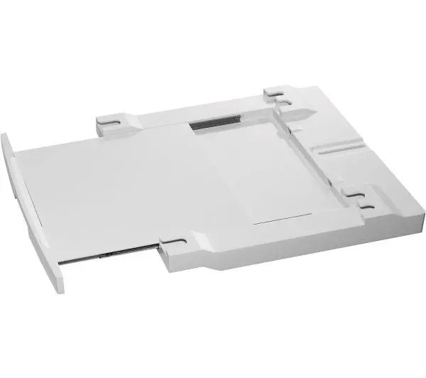Łącznik do pralek i suszarekUzyskaj dodatkową przestrzeń w pomieszczeniu pralniczym dzięki temu zestawowi łączącemu z wysuwaną półką. Pozwala on bezpiecznie zainstalować suszarkę na pralce bez żadnych dodatkowych mocowań. Wysuwana półka umożliwia łatwe wkładanie i wyjmowanie prania i stanowi praktyczne miejsce do składania rzeczy