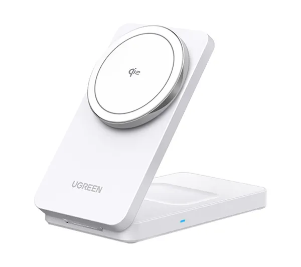 <h2>Magnetyczna ładowarka bezprzewodowa 2w1 UGREEN W706 MagSafe 15W (biała)</h2><p>UGREEN W706 to nowoczesna, magnetyczna ładowarka bezprzewodowa zaprojektowana z myślą o ekosystemie Apple. Umożliwia równoczesne uzupełnianie energii w iPhonie oraz słuchawkach AirPods, dzięki czemu eliminuje potrzebę korzystania z kilku kabli i zasilaczy. Minimalistyczna forma i przemyślana konstrukcja pomagają utrzymać porządek na biurku, a jednocześnie zapewniają wygodny dostęp do obu urządzeń podczas ładowania. To praktyczne rozwiązanie zarówno do pracy, jak i codziennego użytkowania w domu.</p><h2>Ekspresowe uzupełnianie energii</h2><p>Ładowarka W706 została dostosowana do magnetycznego ładowania iPhone’ów serii 12–17 oraz etui AirPods 2, 3 i Pro. Obsługa standardu Qi2 pozwala na bezprzewodowe ładowanie z mocą do 15 W, zapewniając stabilne dopasowanie i optymalną wydajność energetyczną. W praktyce oznacza to szybkie uzupełnianie baterii bez podłączania przewodu – przykładowo iPhone 16 osiąga około 37% naładowania w 30 minut. Magnetyczne pozycjonowanie minimalizuje straty energii i gwarantuje właściwe ułożenie telefonu na cewce.</p><h2>Regulowany uchwyt – komfort w każdej pozycji</h2><p>Zintegrowany, magnetyczny panel ładowania można odchylać w zakresie do 70°, co pozwala dopasować kąt do aktualnego zastosowania. Ustawienie pionowe sprawdza się podczas wideorozmów lub przeglądania powiadomień, natomiast poziome zapewnia wygodę przy oglądaniu filmów czy graniu w gry mobilne. Stabilne mocowanie magnetyczne utrzymuje smartfon w wybranej pozycji bez ryzyka przesunięcia, nawet przy obsłudze jedną ręką.</p><h2>Gotowa do podróży</h2><p>Kompaktowa, składana konstrukcja sprawia, że W706 łatwo zmieści się w torbie, plecaku czy walizce. Waga 235 g pozwala zabrać ją do biura, na uczelnię lub w podróż służbową bez odczuwalnego obciążenia. Po rozłożeniu silikonowe podkładki antypoślizgowe oraz wbudowane obciążenie jej podstawy stabilizują ładowarkę na biurku lub stoliku nocnym, zapobiegając przesuwaniu się na gładkich powierzchniach. Dzięki temu urządzenie pozostaje pewnie na miejscu podczas odkładania telefonu.</p>
