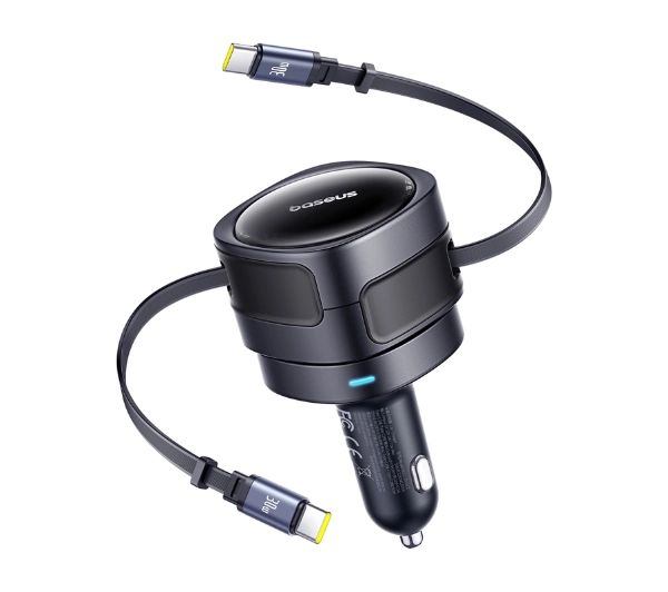 <h2>Ładowarka samochodowa Baseus + 2 kable USB-C 60 W (czarna)</h2><p>Ładowarka samochodowa Baseus umożliwia jednoczesne zasilanie dwóch urządzeń z mocą całkowitą do 60 W. Dwa wbudowane przewody USB-C o długości 80 cm automatycznie się zwijają, zapewniając porządek w kabinie. Ponadto kompatybilność z napięciem 12–24 V oraz obrotowa konstrukcja sprawiają, że produkt doskonale sprawdza się w różnych typach pojazdów.</p> <h2>Przemyślana konstrukcja dla większego komfortu</h2><p>Mechanizm obrotowy 180° umożliwia dowolne ustawienie ładowarki, co znacznie poprawia wygodę użytkowania, zwłaszcza podczas jazdy. Co więcej, dzięki systemowi automatycznego zwijania przewodów unikniesz bałaganu i lepiej zorganizujesz przestrzeń wewnątrz pojazdu.</p> <h2>Wydajne ładowanie</h2><p>Każdy z wbudowanych kabli obsługuje szybkie ładowanie z mocą do 30 W, co pozwala efektywnie zasilać smartfony, tablety i inne urządzenia. Dodatkowo obsługa popularnych protokołów, takich jak PD, QC, SCP i AFC, zapewnia szeroką kompatybilność i wysoką skuteczność.</p> <h2>Zaawansowana ochrona</h2><p>Wbudowany system zabezpieczeń monitoruje temperaturę pracy i chroni przed przegrzaniem, przeciążeniem, przepięciem, nadmiernym rozładowaniem i zwarciem. Dzięki temu ładowarka gwarantuje bezpieczne użytkowanie w każdych warunkach drogowych.</p> <h2>Stabilność bez względu na drogę</h2><p>Dzięki bocznym uchwytom sprężynowym ładowarka pewnie trzyma się w gnieździe zapalniczki. Jej stabilne osadzenie minimalizuje ryzyko przypadkowego rozłączenia, nawet podczas jazdy po nierównych nawierzchniach lub przy nagłym hamowaniu.</p> <h2>Kompatybilność z różnymi pojazdami i nocna wygoda</h2><p>Szeroki zakres obsługiwanego napięcia (12-24 V) sprawia, że urządzenie sprawdzi się zarówno w samochodach osobowych, jak i większych pojazdach. Ponadto delikatne podświetlenie LED ułatwia korzystanie z ładowarki w ciemności, bez konieczności sięgania po dodatkowe źródła światła.</p>