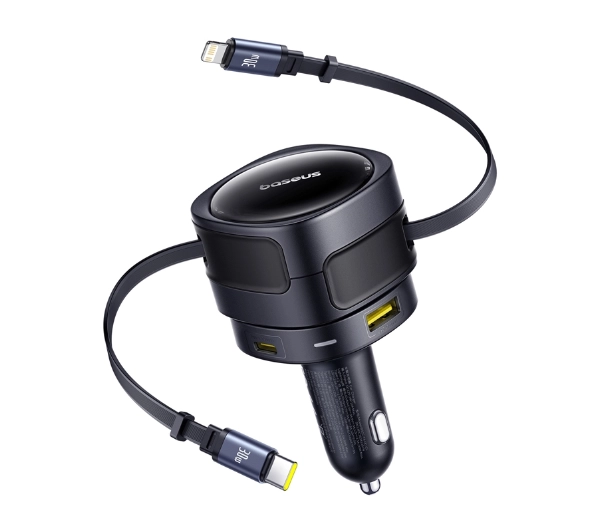 <h2>Ładowarka samochodowa Baseus C+L & U+C Port 90W (czarna)</h2><p>Ładowarka samochodowa Baseus umożliwia jednoczesne zasilanie czterech urządzeń z mocą całkowitą do 90 W. Została wyposażona w dwa porty (USB-A i USB-C) oraz dwa wbudowane przewody (USB-C i Lightning) o długości 80 cm, które automatycznie się zwijają, zapewniając porządek w kabinie. Ponadto kompatybilność z napięciem 12–24 V i obrotowa konstrukcja sprawiają, że produkt doskonale sprawdza się w różnych typach pojazdów.</p> <h2>Przemyślana konstrukcja dla większego komfortu</h2><p>Mechanizm obrotowy 180° umożliwia dowolne ustawienie ładowarki, co znacznie poprawia wygodę użytkowania, zwłaszcza podczas jazdy. Co więcej, dzięki systemowi automatycznego zwijania przewodów unikniesz bałaganu i lepiej zorganizujesz przestrzeń wewnątrz pojazdu.</p> <h2>Wydajne ładowanie</h2><p>Każdy z wbudowanych kabli i portów obsługuje szybkie ładowanie z mocą do 30 W, co pozwala efektywnie zasilać smartfony, tablety i inne urządzenia. Dodatkowo obsługa popularnych protokołów, takich jak PD, QC, SCP i AFC, zapewnia szeroką kompatybilność i wysoką skuteczność.</p> <h2>Zaawansowana ochrona</h2><p>Wbudowany system zabezpieczeń monitoruje temperaturę pracy i chroni przed przegrzaniem, przeciążeniem, przepięciem, nadmiernym rozładowaniem i zwarciem. Dzięki temu ładowarka gwarantuje bezpieczne użytkowanie w każdych warunkach drogowych.</p> <h2>Stabilność bez względu na drogę</h2><p>Dzięki bocznym uchwytom sprężynowym ładowarka pewnie trzyma się w gnieździe zapalniczki. Jej stabilne osadzenie minimalizuje ryzyko przypadkowego rozłączenia, nawet podczas jazdy po nierównych nawierzchniach lub przy nagłym hamowaniu.</p> <h2>Kompatybilność z różnymi pojazdami i nocna wygoda</h2><p>Szeroki zakres obsługiwanego napięcia (12-24 V) sprawia, że urządzenie sprawdzi się zarówno w samochodach osobowych, jak i większych pojazdach. Ponadto delikatne podświetlenie LED ułatwia korzystanie z ładowarki w ciemności, bez konieczności sięgania po dodatkowe źródła światła.</p>
