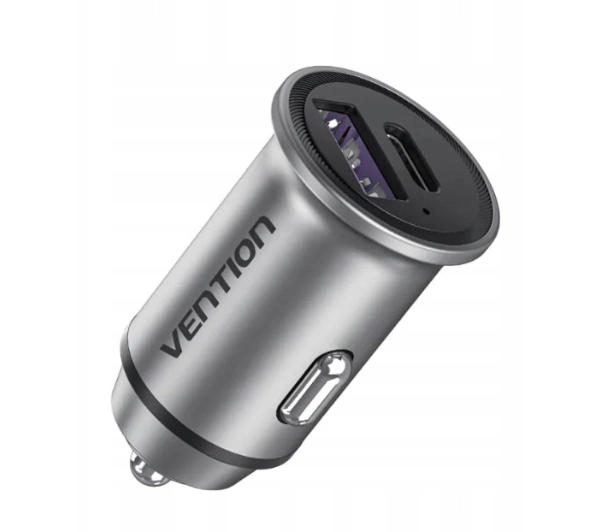 Ładowarka samochodowa Vention 12-24V USB-A USB-C 30W PD Szary