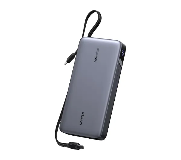 <h2>Powerbank UGREEN PB552 (25 000 mAh, 165 W, wbudowany kabel, szary)</h2><p>UGREEN PB552 to mobilne źródło energii, stworzone z myślą o osobach pracujących intensywnie i działających w wielu miejscach jednocześnie. Pojemność 25 000 mAh w połączeniu z maksymalną mocą wyjściową aż 165 W pozwala zasilać smartfony i tablety, ale także laptopy i bardziej wymagający sprzęt. Dwa zintegrowane przewody USB-C (Universal Serial Bus typu C, interfejs służący do zasilania i ładowania urządzeń) oraz możliwość ładowania nawet czterech urządzeń równolegle sprawiają, że powerbank staje się centralnym hubem zasilania w podróży, biurze mobilnym czy podczas spotkań poza siedzibą firmy. To rozwiązanie dla użytkowników, którzy oczekują pełnej niezależności od gniazdka i stabilnej energii zawsze wtedy, gdy jest potrzebna.</p><h2>Zasilanie kilku urządzeń jednocześnie</h2><p>Zaawansowany układ zarządzania energią umożliwia równoczesne ładowanie nawet czterech sprzętów z inteligentnym rozdziałem mocy. Powerbank potrafi zasilić dwa laptopy jednocześnie (jeden z mocą do 100 W, drugi do 65 W) a przy podłączeniu pojedynczego urządzenia port USB-C zgodny z Power Delivery 3.1 osiąga nawet 140 W. Szeroka kompatybilność z PPS (Programmable Power Supply, standard szybkiego ładowania) oraz ładowaniem Samsung 45 W gwarantuje optymalne parametry zarówno dla ultrabooków, jak i smartfonów czy tabletów. Dzięki temu jedno źródło energii wystarcza do obsługi całego zestawu urządzeń, bez kompromisów w szybkości czy stabilności ładowania.</p><h2>Zintegrowane przewody i szybkie uzupełnianie energii</h2><p>Dwa wbudowane kable USB-C eliminują konieczność noszenia dodatkowych przewodów — po zakończeniu pracy można je schować w obudowie, zachowując porządek i gotowość do użycia. Sam powerbank można naładować w około 2 godziny dzięki wejściu USB-C o mocy do 100 W, co znacząco skraca czas przygotowania do kolejnego dnia pracy. Wyposażono go również w tryb niskiego poboru prądu, aktywowany przytrzymaniem przycisku przez 3 sekundy, który umożliwia bezpieczne ładowanie niewielkich urządzeń, takich jak słuchawki TWS (True Wireless Stereo, prawdziwie bezprzewodowe stereo), smartwatche czy opaski sportowe. To funkcjonalność szczególnie istotna w ekosystemie nowoczesnej elektroniki osobistej.</p><h2>Bezpieczny podczas podróży samolotem</h2><p>Energia na poziomie 90 Wh mieści się w międzynarodowych limitach dla akumulatorów przewożonych w bagażu podręcznym (poniżej 100 Wh). Oznacza to możliwość zabrania powerbanku na pokład samolotu bez dodatkowych procedur i ograniczeń. PB552 sprawdza się więc zarówno w codziennym użytkowaniu, jak i podczas lotów służbowych i dalekich podróży, gdzie dostęp do zasilania bywa ograniczony.</p><h2>Solidna konstrukcja i pełne zabezpieczenia</h2><p>Zastosowanie litowo-jonowych ogniw 21700 klasy motoryzacyjnej przekłada się na wysoką trwałość i stabilne parametry pracy nawet przy dużych obciążeniach. Powerbank wyposażono w kompleksowy system ochrony obejmujący zabezpieczenia przed przepięciem, nadmiernym prądem, przeładowaniem, nadmiernym rozładowaniem, zwarciem oraz przegrzaniem. Potwierdzeniem jakości i zgodności z normami są międzynarodowe certyfikaty CE (Conformité Européenne, zgodność europejska), KC (Korea Certification, zgodność koreańska), RoHS (Restriction of Hazardous Substances, ograniczenie stosowania niebezpiecznych substancji) oraz PSE (Product Safety Electrical Appliance & Materials, japoński certyfikat bezpieczeństwa). W praktyce oznacza to niezawodne i bezpieczne źródło energii, na którym można polegać każdego dnia — niezależnie od miejsca i intensywności użytkowania.</p>