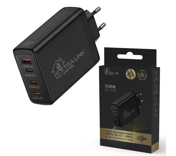 Informacje dodatkowe: Extralink Smart Life Fast Charger 100W GaN to ładowarka sieciowa z 3x USB-C, 1x USB-A, technologią GaN, mocą 100W, obsługująca szybkie ładowanie (Power Delivery, QuickCharge, SuperVOOC) i zabezpieczenia przed przegrzewaniem i przeciążeniem