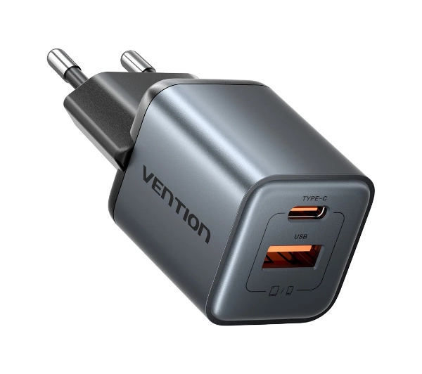 Ładowarka sieciowa Vention 1x USB-A 1x USB-C GaN 30W Szary