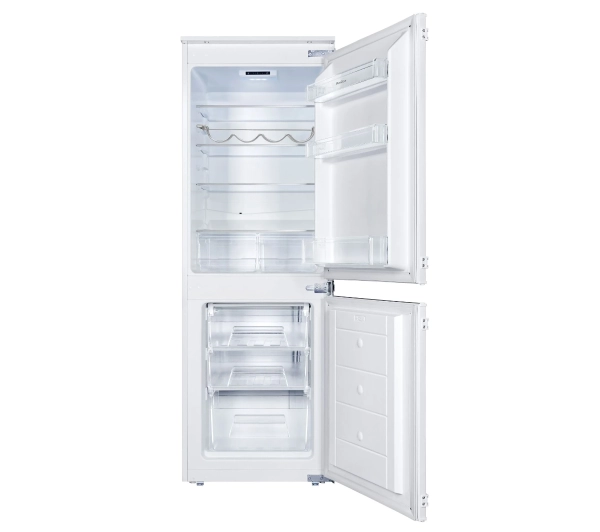 Wyposażenie: 4 półki szklane, 1 półka na butelki, 3 półki w drzwiach, pojemnik na jajka, 2 szuflady na warzywa i owoce