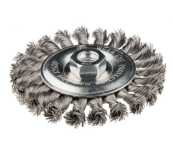 Szczotka druciana GRAPHITE wykonana z drutu ze stali nierdzewnej o grubości 0.5 mm. Wzmocniona konstrukcja korpusu pozwala na wydajne czyszczenie konstrukcji stalowych ze stali nierdzewnej i stali kwasoodpornej. Mocowanie przystosowane do współpracy ze szlifierkami kątowymi.Szczotka druciana tarczowa uchwyt M14, INOX, drut splatany O 0.5 mm