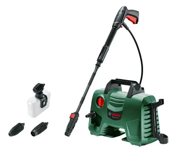 - Wyposażenie: dysza Fan Jet, dysza rotacyjna, filtr wody, instrukcja obsługi, lanca, pianownica, pistolet spryskujący, wąż