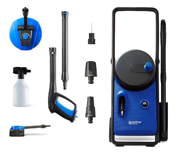 Wyposażenie: adapter do węża ogrodowego, bęben na wąż, dysza Tornado, dysza Turbo, instrukcja obsługi, karta gwarancyjna, lanca, pianownica, pistolet, szczotka do mycia tarasów, szczotka obrotowa, wąż wysokociśnieniowy