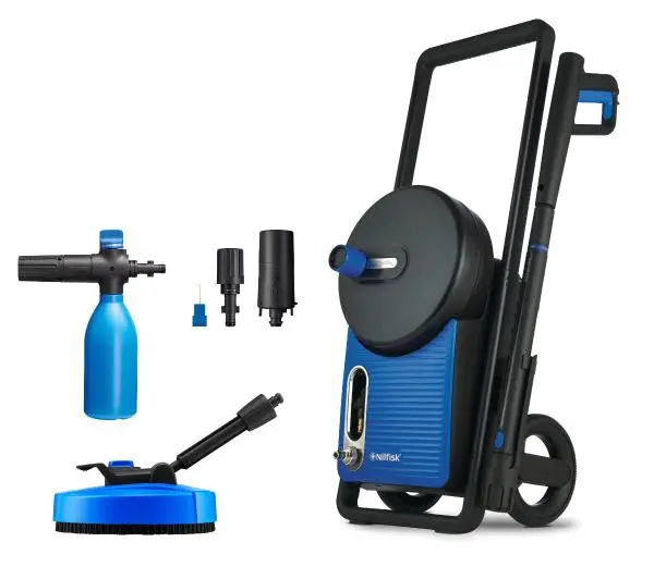 Wyposażenie: adapter do węża ogrodowego, bęben na wąż, dysza 3w1, dysza samochodowa, instrukcja obsługi, karta gwarancyjna, lanca, pianownica, pistolet, schowek na narzędzia, szczotka do mycia tarasów, wąż wysokociśnieniowy