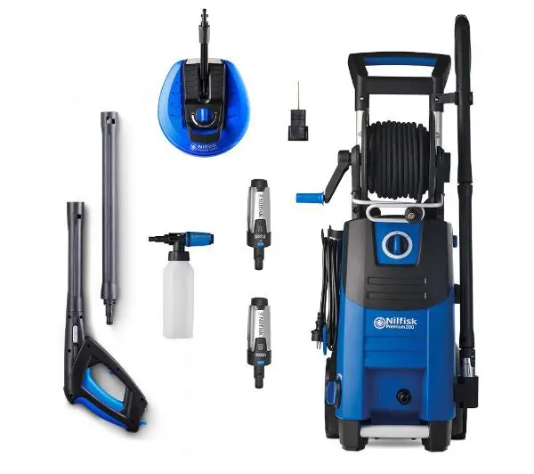 Wyposażenie: adapter do węża ogrodowego, bęben na wąż, dysza płaskostrumieniowa, dysza rotacyjna, filtr wody, instrukcja obsługi, karta gwarancyjna, lanca, pianownica, pistolet, szczotka do mycia tarasów, wąż wysokociśnieniowy