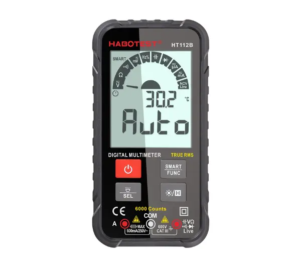 <h2>Cyfrowy multimetr uniwersalny Habotest HT112B True RMS</h2><p>Cyfrowy multimetr uniwersalny Habotest HT112B posiada duży wyświetlacz o przekątnej 2,88 cala oraz silikonowe przyciski, które sprawiają, że obsługa jest intuicyjna i wygodna. Umożliwia dokładne pomiary różnych parametrów. Jest kompaktowy, lekki i wyposażony w latarkę LED, co pozwala pracować w słabo oświetlonych miejscach. Zasilają go 2 baterie CR2032 3 V.</p> <h2>Przemyślany design</h2><p>Ten poręczny multimetr zaprojektowano z myślą o komforcie użytkowania. Jest niewielki i poręczny – jego grubość to tylko 1,9 cm. Wyświetlacz 2,88 cala zapewnia łatwy dostęp do wszystkich istotnych informacji, a duże, silikonowe przyciski ułatwiają obsługę.</p> <h2>Szerokie możliwości</h2><p>Urządzenie marki Habotest jest niezwykle precyzyjne. Dokładnie mierzy napięcie AC i DC, opór oraz pojemność, a także wykrywa aktywność kabli. Pozwala testować diody, sprawdzać ciągłość, realną wartość RMS oraz umożliwia bezdotykowe wykrywanie napięcia (NCV). HT112B charakteryzuje się inteligentnym działaniem oraz funkcją autodetekcji ACV.</p> <h2>Przyjazny dla użytkownika</h2><p>Multimetr został zaprojektowany z dbałością o szczegóły. Wbudowana latarka LED zapewnia jasne oświetlenie w ciemnych miejscach. Z kolei miękka obudowa zabezpiecza urządzenie przed uszkodzeniami. Dodatkowo wymiana baterii w HT112B jest prosta i bezproblemowa.</p>