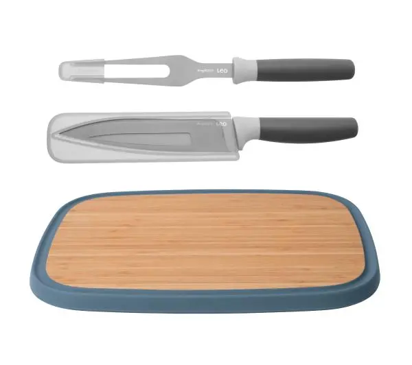 Krojenie szynki, indyka, kurczaka itp. nigdy nie było łatwiejsze dzięki temu kompletnemu zestawowi do krojenia mięsa i wędlin. Widelec bezpiecznie utrzymuje mięso, ryby lub drób w miejscu, podczas cięcia precyzyjnych plasterków ostrym nożem ze stali nierdzewnej. Nieprzywierająca powłoka ostrza sprawia, że jedzenie nie przywiera do noża, a miękka w dotyku rękojeść widelca i noża zapewniają wygodny uchwyt ułatwiający obsługę. Stylowa bambusowa deska do krojenia jest solidna, ale jednocześnie lekka i ma zintegrowany rowek, który zbiera soki podczas krojenia.