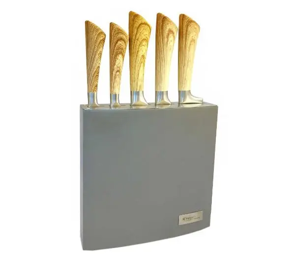 Informacje dodatkowe: Zestaw 5 noży ze stali nierdzewnej z pochwytem typu soft touch, w bloku drewnianym lakierowanym.