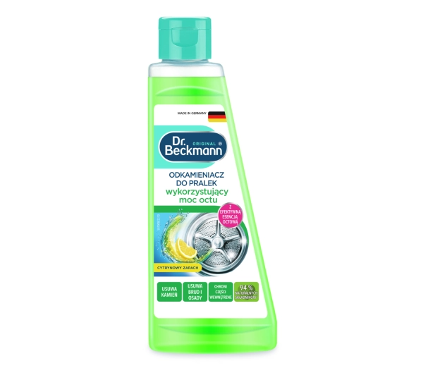 <h3>Dr. Beckmann Odkamieniacz do pralek 250 ml.</h3><p>Odkamieniacz do pralek eliminuje odkładanie się kamieni, delikatnie usuwa brud i pozostałości detergentu, a jednocześnie chroni wewnętrzne części prali. Jego octowa esencją jest skuteczna już od 40° C.</p><p> </p><a>Szczegółowa Karta Charakterystyki wyrobu.</a>