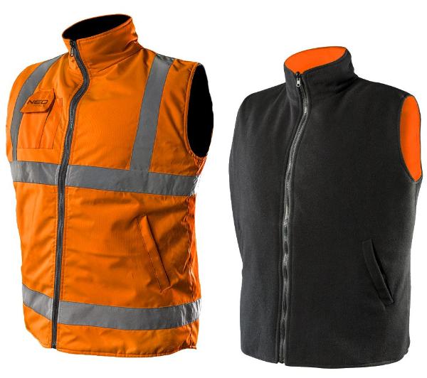 Bezrękawnik roboczy, dwustronny, jedna strona odblaskowa pomarańczowa (klasa 2 wg. normy EN ISO 20471), wodoodporna pokryta PU, druga strona polar, wysoka stójka, certyfikat CE