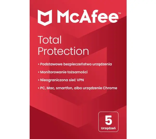 <h2>To, co robisz online, to Twoja prywatna sprawa. Dbamy o to, by tak pozostało.</h2><a>Zabezpiecz swoje cyfrowe życie</a> <h2>McAfee® Total Protection</h2><p>Niezbędna ochrona danych osobowych i prywatności online, dzięki której możesz spokojnie korzystać z Internetu. Obejmuje: antywirus premium, ochronę sieciową, monitorowanie tożsamości, funkcję Bezpieczny VPN i nie tylko. Doświadcz cyfrowego życia bez strachu przed zagrożeniami takimi jak ransomware, złośliwe oprogramowanie i phishing.</p> <h3>Wskaźnik ochrony McAfee: Spersonalizowane informacje zwiększają Twoje bezpieczeństwo</h3><p>Wskaźnik ochrony pokazuje poziom Twojego bezpieczeństwa w Internecie i pomaga łatać luki w zabezpieczeniach dzięki prostym instrukcjom. Pomagamy Ci także w pełni korzystać z zakupionej ochrony, informując Cię o nieskonfigurowanych funkcjach.</p> <h3>Bezpieczny VPN – Korzystaj z Internetu, tak jak lubisz, a my będziemy chronić Twoją prywatność</h3><p>Niezależnie od tego, czy płacisz rachunki, zarządzasz inwestycjami czy wyszukujesz informacje, Bezpieczny VPN pomoże Ci zachować prywatność. VPN może automatycznie włączać się w publicznych sieciach Wi-Fi, chroniąc poświadczenia konta, nawyki wyszukiwania i nie tylko.</p> <h3>Monitorowanie tożsamości – Twoja tożsamość to Twoja sprawa – niech tak pozostanie</h3><p>Liczy się każda sekunda. Pomagamy Ci monitorować adresy e-mail, numer PESEL, konta bankowe, karty kredytowe i nie tylko. Jeśli wykryjemy jakąś zmianę, wyślemy Ci ostrzeżenie średnio o 10 miesięcy szybciej niż podobne usługi konkurencji.</p> <h3>Ochrona wielu urządzeń</h3><p>Ochrona wszystkich kompatybilnych urządzeń, PC z systemem Windows, komputerów Mac, smartfonów i tabletów w ramach jednej subskrypcji.</p><h3>OchronaCentrum</h3><p>Nasze Protection Center to oparta na przeglądarce aplikacja, która umożliwia monitorowanie danych przechowywanych online i tożsamości z dowolnego miejsca.</p><h3>Menedżer haseł</h3><p>Zabezpiecz konta poprzez generowanie i przechowywanie złożonych haseł oraz automatyczne wprowadzanie informacji, aby szybciej logować się na różnych urządzeniach.</p> <h2>Ochrona, której potrzebujesz</h2> <h3>Sprawdzone zabezpieczenia</h3><p>dla ponad 600 milionów urządzeń</p><h3>Najwyższe</h3><p>oceny za bezpieczeństwo od SE Labs</p><h3>42 miliony</h3><p>zablokowanych zagrożeń dziennie</p> <table> <tbody> <tr> <td> <p>McAfee Total Protection 1 urządzenie 9,99 zł/miesiąc</p> </td> </tr> <tr> <td> <p>Licencjonowanie 1 urządzenie</p> </td> </tr> <tr> <td> <p>Bezpieczny VPN Chroń swoją prywatność online zawsze i wszędzie dzięki nieograniczonej sieci VPN.</p> <p>1 licencja</p> </td> </tr> <tr> <td> <p>Menedżer haseł Łatwo twórz i przechowuj silne i unikalne hasła dla każdego konta.</p> <p>1 profil użytkownika</p> </td> </tr> <tr> <td> <p>Większe bezpieczeństwo Pierwszy w branży wskaźnik ochrony McAfee i wskazówki na temat zwiększenia bezpieczeństwa.</p> </td> </tr> <tr> <td> <p>Monitorowanie tożsamości Monitoruje Twoje dane osobowe i na bieżąco wysyła alerty</p> </td> </tr> <tr> <td> <p>Nagradzana ochrona Wiodąca w branży ochrona przed ewoluującymi zagrożeniami</p> </td> </tr> </tbody></table><table> <tbody> <tr> <td> <p>McAfee Total Protection 5 urządzeń 19,99 zł/miesiąc</p> </td> </tr> <tr> <td> <p>Licencjonowanie 5 urządzeń</p> </td> </tr> <tr> <td> <p>Bezpieczny VPN Chroń swoją prywatność online zawsze i wszędzie dzięki nieograniczonej sieci VPN.</p> <p>5 licencji</p> </td> </tr> <tr> <td> <p>Menedżer haseł Łatwo twórz i przechowuj silne i unikalne hasła dla każdego konta.</p> <p>5 profili użytkownika</p> </td> </tr> <tr> <td> <p>Większe bezpieczeństwo Pierwszy w branży wskaźnik ochrony McAfee i wskazówki na temat zwiększenia bezpieczeństwa.</p> </td> </tr> <tr> <td> <p>Monitorowanie tożsamości Monitoruje Twoje dane osobowe i na bieżąco wysyła alerty</p> </td> </tr> <tr> <td> <p>Nagradzana ochrona Wiodąca w branży ochrona przed ewoluującymi zagrożeniami</p> </td> </tr> </tbody></table> <h3>System operacyjny</h3><ul> <li>Procesory X64: Procesory X64: Microsoft Windows 11 i Windows 10 (RS5) lub nowsze</li> <li>Procesory ARM64: Microsoft Windows 11 lub nowszy</li> <li>Kompilacja 4.11.1 lub nowsza: system macOS 10.15 lub nowszy</li> <li>Kompilacja 4.9.1: system macOS 10.12–10.14</li> <li>Smartfony i tablety z systemem Google Android 7 lub nowszym</li> <li>Apple iOS w wersji 13 lub nowszej</li> <li>ChromeOS 102.0.5005 i nowsze wersje</li></ul><h3>Obsługiwane przeglądarki</h3><ul> <li>Firefox</li> <li>Google Chrome</li> <li>Safari (tylko systemy Mac i iOS)</li> <li>Microsoft Edge (oparta na technologii Chromium)</li></ul><h3>Sprzęt</h3><ul> <li>2 GB pamięci RAM</li> <li>1,3 GB wolnego miejsca na dysku</li> <li>Procesor 1 GHz</li></ul><p>Wymagane połączenie z InternetemZalecane szybkie łącze</p>