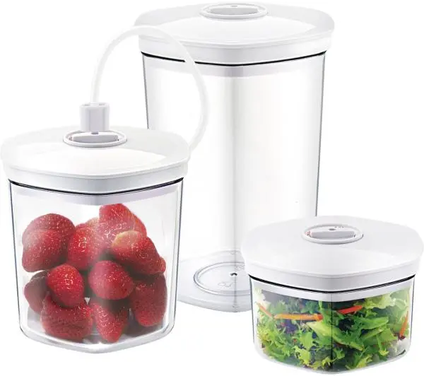 Zestaw pojemników próżniowych wielokrotnego użytku:<ul> <li>0,75 litra, wysokość 7 cm</li> <li>1,4 litra, wysokość 12,5 cm</li> <li>2 litry, wysokość 18 cm.</li></ul>Pojemniki działają próżnionowo jedynie ze zgrzewarkami Caso Germany. Można je myć w zmywarce.