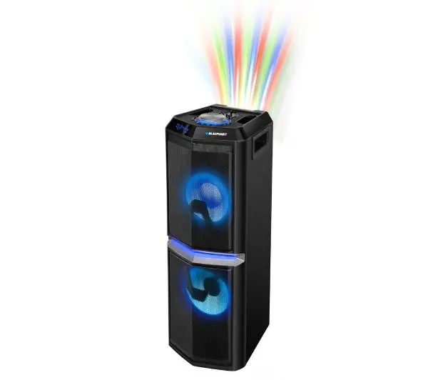 Funkcje dodatkowe: 2x wejście mikrofonowe , czytnik kart pamięci SD, karaoke, podświetlenie diodami LED, USB - muzyka, wbudowane kółka i uchwyt