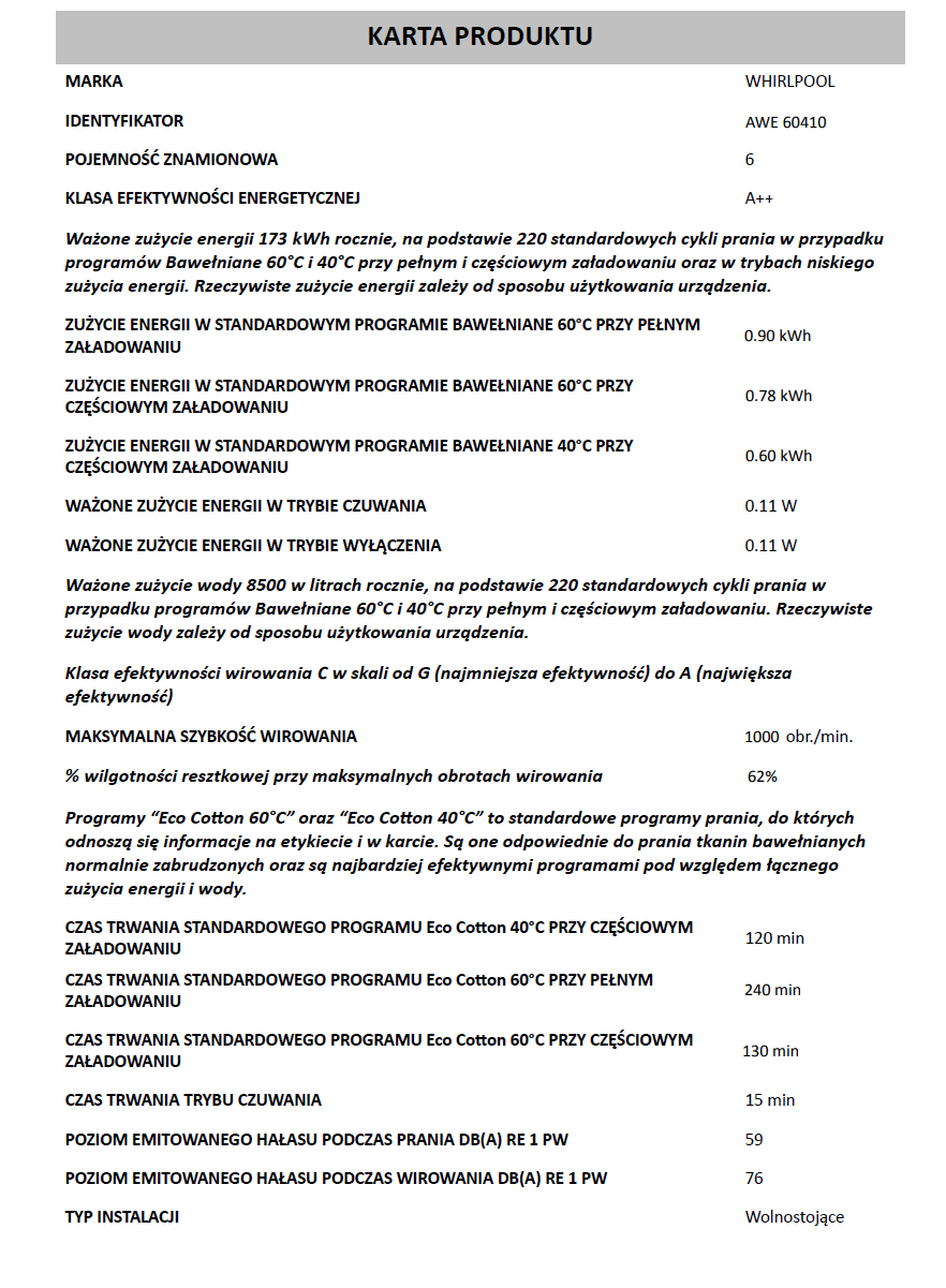 Specjalnie dla Ciebie pralka AWE60410 posiada:<p>Maksymalna pojemność: 6kgWybór dla tych, którzy piorą solo lub rzadko.</p><p>Prędkość obrotowa: 1000 obr/min</p><p>Klasa energetyczna A++</p>Super szybki 15 min<p>Czyste ubrania bez kompromisu.</p>Opóźnienie startu<p>Pranie odłóż na później.</p>Klasa energetyczna A++<p>Zużywa ok. 20% mniej energii od urządzenia w klasie A, zachowując doskonałe efekty pracy.</p>Super szybki 15 min Czyste ubrania bez kompromisu<p>Program super szybki 15 min, odświeża lekko zabrudzoną odzież w 15 minut.</p>Opóźnienie startu Pranie odłóż na później<p>Dzięki funkcji "Opóźnienie startu" możesz ustawić wybrany program, aby zaczynał się w najbardziej dogodnym dla Ciebie momencie - na przykład w nocy lub gdy obowiązuje niższa stawka za energię.</p>Klasa energetyczna A++ Zmniejsz rachunki za prąd<p>Pralka AWE60410 zużywa do 20% mniej energii elektrycznej w porównaniu do standardowych urządzeń w klasie A, jednocześnie zachowując doskonałe efekty pracy.</p>