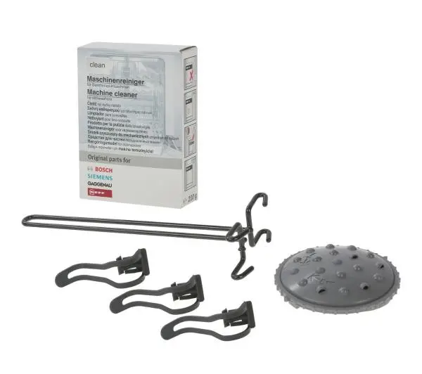 <ul> <li>Zestaw do zmywarki w skład którego wchodzi: środek do czyszczenia, głowica natryskowa, 1 stojak na butelki, 3 sztuki klamer na drobne elementy</li> <li>Środek do czyszczenia zmywarki skutecznie usuwa resztki tłuszczu oraz osad</li> <li>Zaleca się jego używanie co 4-6 miesiące</li> <li>Opakowanie zawiera 200 g</li> <li>Stojak na butelki doskonale utrzymuje butelki, wazony w zmywarce, podczas mycia</li> <li>Głowica natryskowa jest idealna do mycia dużych naczyń takich jak blachy, ruszty, a także metalowych filtrów do okapów</li> <li>Klamry doskonale przytrzymuja małe elementy podczas zmywania</li> <li>Pasuje do: SMS30E02TR, SMS40C02GB, SMS43D08TR, SHX7ER55UC, SMS20E02TR, SMS43D02TR, SMV50M40EU, SMV50C00GB, SMI69M85EU, SMS40E32EU, SMV69M80EU</li></ul><h3>Karta Charakterystyki</h3>Dane dotyczące dostawcy karty charakterystykiProducent:ORO-Produkte Marketing International GmbH,Im Hengstfeld 47,32657 Lemgo, Niemcytel. +49 (0)5261-28893-0, faks +49 (0)5261-28893-48www.oro-marketing.deDystrybutor:BSH Hausgerate Service GmbH,Carl-Wery-Strabe 34,81739 Munchen, Niemcytel. +49 (0)89-20355777 (24h), faks +49 (0)89-20355744 (24h)spareparts@bsgh.comInformacji udziela:Herr Zobel+49 (0)89-4590-3813MCW-KDT-Gefahrstoffe@bshg.comPodczas godzin pracy biurowejNumer alarmowy spółki: +49 (0)5261-28893-0 (08:00-16:00)<h3>SKŁAD / INFORMACJA O SKŁADNIKACH</h3>Niebezpieczne składniki w rozumieniu dyrektywy EWG 67/548 i rozporządzenia CLP oraz powiązana klasyfikacja:<ul> <li>50-60% Węglan sodu</li> <li>10-<20% Kwas krzemowy, sól sodowa</li> <li>5-<10% Peroksohydrat węglanu sodowego</li></ul><table> <tbody> <tr> <td></td> <td>Niebezpieczeństwa: <ul> <li>H302 Działa szkodliwie po połknięciu.</li> <li>H315 Działa drażniąco na skórę.</li> <li>H318 Powoduje poważne uszkodzenie oczu.</li> <li>H319 Działa drażniąco na oczy.</li> <li>H335 Może powodować podrażnienie dróg oddechowych.</li> <li>H272 Może intensyfikować pożar, utleniacz.</li> </ul> </td> </tr> </tbody></table><a>Szczegółowa Karta Charakterystyki wyrobu.</a>