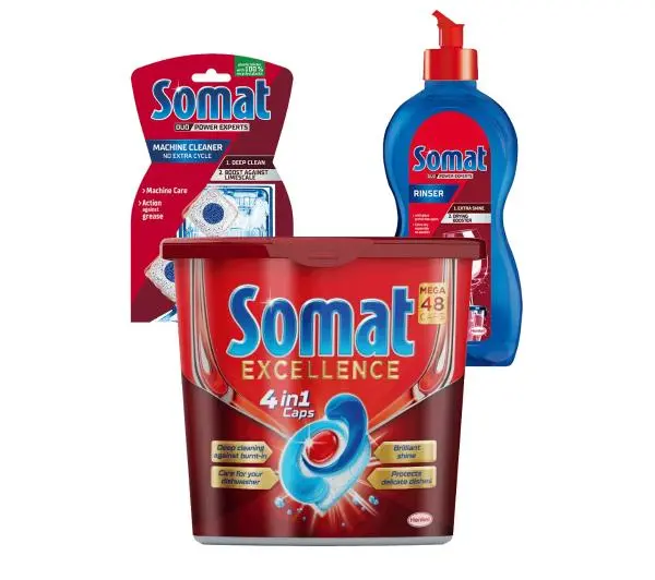 Zestaw startowy do zmywarki Somat Excellence 4 in 1 48szt. + tabletki do czyszczenia zmywarki 3szt. + nabłyszczacz 500ml