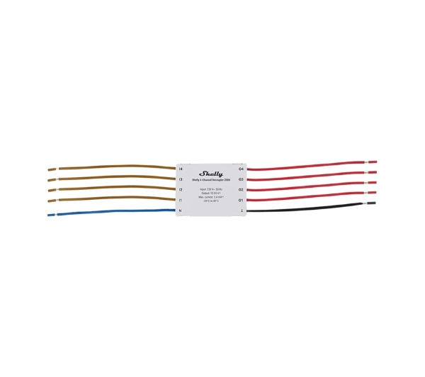 <h2>Odsprzęgacz 4-kanałowy Shelly Decoupler 230V</h2><p>Shelly 4-Channel Decoupler 230V to niewielki moduł zaprojektowany do bezpiecznego wyzwalania wejść DC (Direct Current, prąd stały) przy użyciu standardowych sygnałów AC (Alternating Current, prąd przemienny). Zastosowany optoizolator oddziela od siebie obwody elektryczne, co zwiększa bezpieczeństwo instalacji i chroni podłączone urządzenia przed wysokim napięciem. Dzięki temu system może działać stabilnie nawet w bardziej wymagających konfiguracjach. Kompaktowa konstrukcja ułatwia integrację z różnymi elementami instalacji automatyki.</p><h2>Idealny wybór do modernizacji instalacji</h2><p>Model Shelly 4-Channel Decoupler 230V sprawdzi się szczególnie w projektach modernizacji istniejących instalacji elektrycznych. Umożliwia wykorzystanie tradycyjnych przełączników AC do sterowania urządzeniami działającymi w obwodach DC. Dzięki temu nie ma potrzeby wymiany dotychczasowych elementów sterujących. Rozwiązanie to jest szczególnie przydatne podczas modernizacji oświetlenia lub systemów automatyki domowej. Pozwala łatwo rozszerzyć funkcjonalność instalacji bez skomplikowanych przeróbek.</p><h2>Integracja z urządzeniami Shelly</h2><p>Moduł został zaprojektowany z myślą o współpracy z wieloma urządzeniami z ekosystemu Shelly. Może współdziałać między innymi z modelami Shelly Plus RGBW PM, Shelly Pro RGBWW PM, Shelly Plus Uni oraz Shelly Plus Add-On, co pozwala bez problemu włączyć go do istniejącego systemu inteligentnego oświetlenia lub automatyki. Takie połączenie umożliwia tworzenie bardziej rozbudowanych scenariuszy działania instalacji. Całość daje dużą elastyczność podczas projektowania inteligentnych systemów sterowania.</p><h2>Obsługa przycisków i czujników</h2><p>Shelly 4-Channel Decoupler 230V umożliwia podłączenie wielu typów urządzeń sterujących i czujników. Moduł współpracuje z zewnętrznymi przyciskami, przekaźnikami oraz różnymi czujnikami wykrywającymi zdarzenia w otoczeniu. Można do niego podłączyć na przykład czujniki PIR (Passive Infrared, pasywny czujnik podczerwieni wykrywający ruch), czujniki mikrofalowe, sterowniki oświetlenia czy czujniki zbliżeniowe. Pozwala to tworzyć instalacje reagujące na ruch, obecność użytkowników lub inne zmiany w otoczeniu. Dzięki temu system automatyki da się łatwo dopasować do indywidualnych potrzeb.</p><h2>Kompaktowa konstrukcja ułatwiająca montaż</h2><p>Niewielkie wymiary modułu – zaledwie 44 × 34 × 7 mm – pozwalają na montaż nawet w ograniczonej przestrzeni instalacyjnej. Urządzenie waży jedynie 25 g, dlatego nie obciąża instalacji i można bez problemu umieścić je w puszce elektrycznej. Co więcej, biała obudowa oraz oznaczone kolorami przewody (brązowy, niebieski, czerwony i czarny) ułatwiają prawidłowe podłączenie. Instalację usprawniają także kable o długości 80 mm i przygotowane końcówki o długości 5 mm.</p><h2>Energooszczędna praca i stabilne parametry</h2><p>Shelly 4-Channel Decoupler 230V pracuje przy napięciu 230 V~ 50 Hz i pobiera mniej niż 0,6 W mocy. Tak niski pobór sprawia, że moduł może pracować w instalacji bez zauważalnego wpływu na zużycie energii. Urządzenie zostało zaprojektowane do działania w temperaturach od 0°C do 40°C, a zakres wilgotności pracy wynosi od 30 do 70% RH (Relative Humidity, wilgotność względna powietrza). Dzięki tym parametrom urządzenie sprawdzi się w typowych warunkach domowych czy biurowych.</p>
