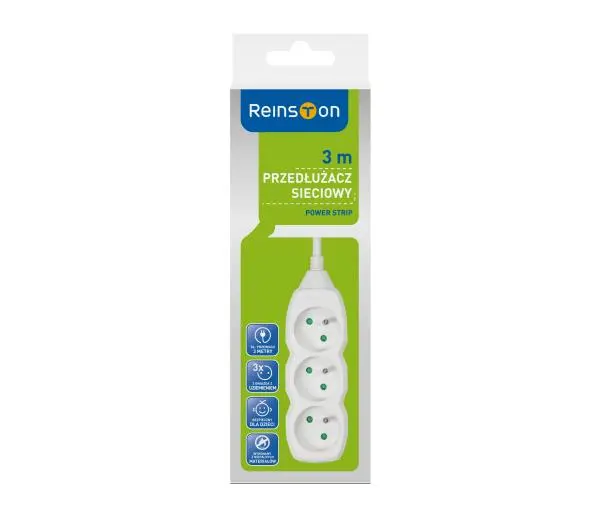 <h3>Przedłużacz sieciowy Reinston</h3><p>Przedłużacz sieciowy Reinston to niezwykle praktyczne rozwiązanie dla domów, biur i firm, czyli wszędzie tam, gdzie istnieje potrzeba podłączenia wielu urządzeń jednocześnie. Konstrukcja przedłużacza jest wykonana z materiałów niepalnych a gniazda są wyposażone w uziemienie. Wszystkie gniazda sieciowe posiadają zabezpieczenie uniemożliwiające wsunięcie dziecku przedmiotów do środka, co chroni je przed porażeniem prądem oraz sprawia, że stosowanie przedłużacza w domu nie stwarza zagrożenia. </p> <p> </p><h3>Główne cechy</h3><p>• 3 gniazda z uziemieniem• Długość przewodu 3 m• Bezpieczny dla dzieci • Obudowa wykonana z materiałów niepalnych• Podświetlany włącznik sieciowy ( tylko EPRZ005,EPRZ006,EPRZ007)• Kolor: biały </p>