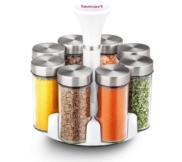 Komplet naczyń do przypraw z obrotowym stojakiem - 8 szt.<ul> <li>Komplet naczyń do przypraw na obrotowym stojaku z tworzywa z niebieskim designem.</li> <li>Uchwyt do przenoszenia.</li> <li>Naczynia na przyprawy wyprodukowano z wytrzymałego szkła przeznaczonego także do mycia w zmywarkach bez wieczka.</li> <li>Pojemność naczynia na przyprawy 85ml.</li> <li>Bez przypraw.</li></ul>