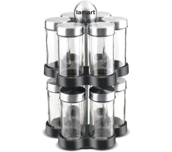 Komplet naczyń do przypraw z obrotowym stojakiem - 12 szt.<ul> <li>Komplet naczyń do przypraw na obrotowym stojaku z niebieskim designem.</li> <li>Naczynia na przyprawy wyprodukowano z wytrzymałego szkła przeznaczonego także do mycia w zmywarkach bez wieczka</li></ul>