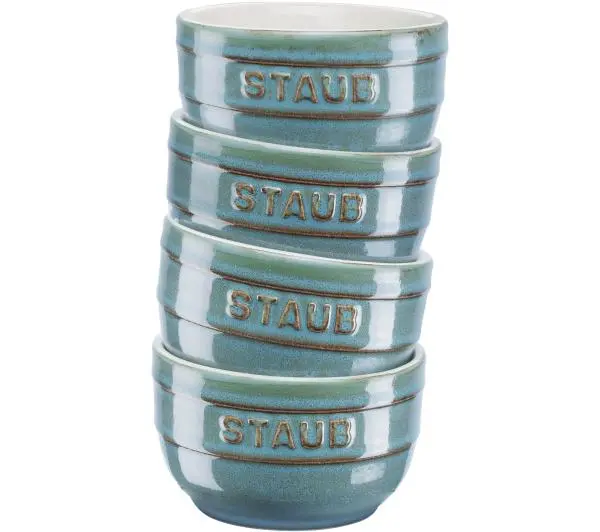 Zestaw czterech ramekinów idealnie nadaje się do przygotowania pojedynczych porcji przystawek, dodatków czy maleńkich, pieczonych deserów. Dzięki najwyższej jakości ceramiki są odporne na zarysowania, trwałe i optymalnie rozprowadzają ciepło. Emaliowana powierzchnia ułatwia czyszczenie i umożliwia mycie w zmywarce. Dzięki niej oraz optymalnemu kształtowi miseczek można je układać w wygodne stosy, oszczędzając miejsce w szafce czy na kuchennym blacie.Ramekiny dostępne są w aż czterech unikatowych kolorach: soczystej, wiśniowej czerwieni, eleganckiej kości słoniowej, antycznej szarości oraz turkusu. Dzięki temu zachwycą Cię nie tylko funkcjonalnością, ale też idealnym wpasowaniem w otoczenie oraz – po prostu – ponadczasowym designem. Oliwki w przyprawach, pomidorki koktajlowe, orzeszki – wszystkie przekąski nabiorą ponadprzeciętnego wyglądu. Serwowane do smakołyków dipy i sosy nagle zaprezentują się niesamowicie. A jeśli lubisz słodkości, nic nie stoi na przeszkodzie, aby przygotować i podać w nich fantastyczne babeczki.Twoi goście zaniemówią z zachwytu i poczują się niczym w najlepszej restauracji. Maleńka porcja risotto? Tapas? Szalej do woli i wprawiaj w osłupienie dzięki ramekinom Staub Ceramique.