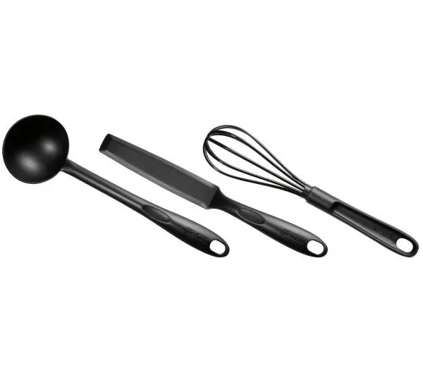 Zestaw przyborów kuchennych do przygotowywania naleśników.<ul> <li>W zestawie: chochla, łopatka, trzepaczka.</li> <li>Kolor: czarny.</li> <li>Odporne na temperaturę do 220°C, bez BPA. </li> <li>Możliwość mycia w zmywarce</li></ul>