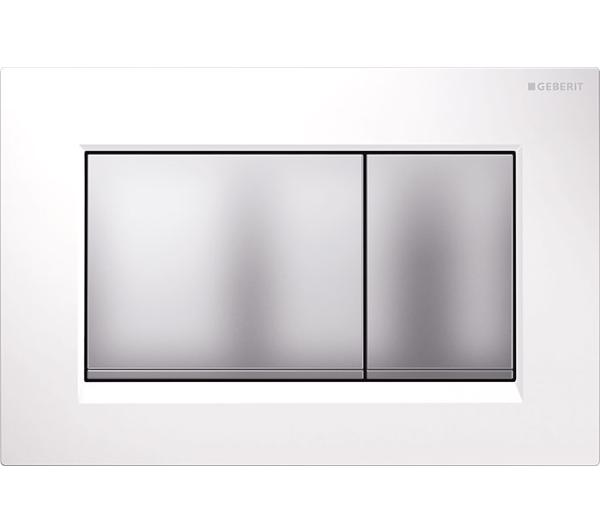 Przycisk uruchamiający Geberit Sigma30, do spłukiwania dwudzielnego<ul> <li>Do uruchamiania spłukiwania w spłuczkach podtynkowych Geberit Sigma</li> <li>Uruchamianie z przodu</li> <li>Popychacze izolowane akustycznie, szybki montaż bez użycia narzędzi</li> <li>Wymiary: 246x164 mm</li> <li>Kolor: Płyta i przyciski: chrom matowy Paski ozdobne: biały/chrom matowy</li></ul>