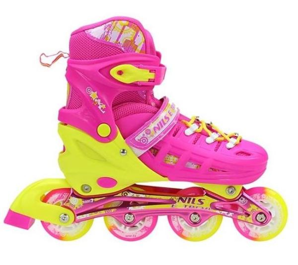 NA1005A Nils Extreme to łyżworolki przeznaczone dla najmłodszych pasjonatów jazdy. Ich atrakcyjny wygląd to efekt nie tylko ciekawego wzornictwa, ale przede wszystkim użycia bardzo wysokiej jakości materiałów.Lekki i wytrzymały but wraz z systemem pasków (na rzep, klamra dwusekcyjna) zapewnia maksymalne bezpieczeństwo. Za pomocą prostego systemu regulacji można łatwo i szybko dopasować rozmiar do stopy użytkownika.Łyżworolka wyposażona jest w specjalną aluminiową płozę. Z kolei duże kółka oraz łożyska klasy ABEC 7 pozwalają na mniejsze opory toczenia, czyli szybszą jazdę. Model dostępny jest w dwóch atrakcyjnych wersjach kolorystycznych.