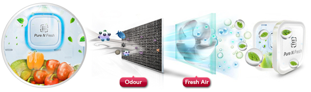 Pure N Fresh to system oczyszczający lodówkę z niepożądanych zapachów. Powietrze wewnątrz lodówki jest poddawane ciągłemu procesowi cyrkulacji i filtracji, dzięki czemu zapachy produktów nie mieszają się.