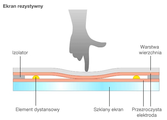 Ekrany rezystancyjne (opornościowe) - Ekrany takie określane są „panelami wrażliwymi na nacisk” lub „panelami z warstwą analogowo-rezystancyjną”. W tej technologii miejsce dotyku ekranu przez palec, stylus lub inny obiekt, jest określane dzięki wykryciu zmian w nacisku. Taki monitor posiada prostą wewnętrzną budowę: szklany ekran i błona wierzchniej warstwy są rozdzielone cienką przerwą, na obu znajdują się przeźroczyste elektrody (warstwa elektrody). Naciśnięcie powierzchni ekranu zwiera elektrodę warstwy wierzchniej z elektrodą szklanego ekranu, umożliwiając przepływ prądu między nimi. Miejsce zwarcia jest identyfikowane przez pomiar zmiany napięcia.