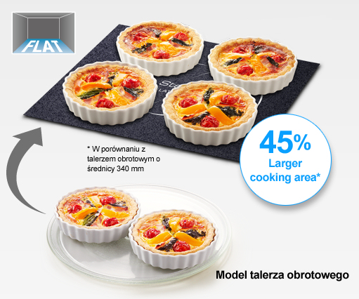 Kuchenka, zamiast tradycyjnego talerza obrotowego, posiada konstrukcję Flatbed. Dzięki temu możliwe jest przygotowywanie potraw w naczyniach o dowolnym kształcie o rozmiarze, a także zwiększa się powierzchnia gotowania.