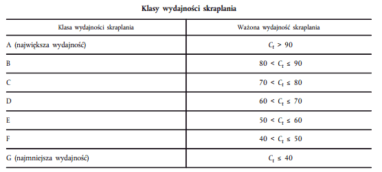 Wydajność skraplania, dla bębnowych suszarek kondensacyjnych, określana jest na podstawie ważonej wydajności skraplania (Ct). Skala od A do G grupuje urządzenie od najbardziej wydajnych do tych z mniejsza wydajnością skraplania. Klasa urządzenie wyznaczana jest według dyrektywy UE.