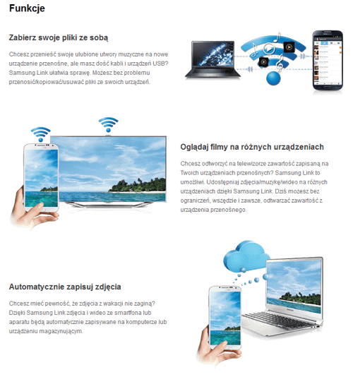 Aplikacja Samsung Link pozwala na korzystanie ze swoich materiałów w dowolnym momencie, na każdym urządzeniu. Umożliwia odtwarzanie treści zapisanych na smartfonie lub tablecie oraz zarządzanie nimi. Bez używania przewodów, możemy np. oglądać film zapisany "w chmurze" na innym inteligentnym urządzeniu. Funkcja pozwala także automatycznie przesyłać i zapisywać od razu w pamięci komputera, zdjęcia wykonane za pomocą telefonu.