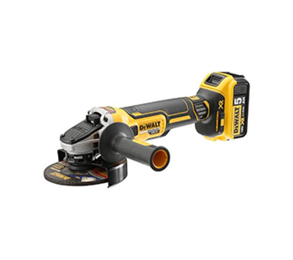 Szlifierka kątowa XR Li-Ion 125mm z silnikiem bezszczotkowym 18 V, włącznik suwakowy (z 2 akumulatorami 5.0Ah, ładowarką i kufrem).<ul> <li>Silnik bezszczotkowy 18 V</li> <li>Hamulec elektroniczny szybko zatrzymuje tarczę po puszczeniu przełącznika</li> <li>Sprzęgło elektroniczne minimalizuje odskok w przypadku przychwycenia lub zablokowania tarczy</li> <li>Siatkowe osłony niedopuszczają, by kurz był zasysany przez silnik</li> <li>Gumowe chwyty zapewniają lepszy chwyt i wygodę</li> <li>Dwupozycyjna rękojeść boczna zapewnia lepszą wygodę i kontrolę</li> <li>Akumulator 18V XR Li-Ion zapewnia moc i wydajność</li></ul>