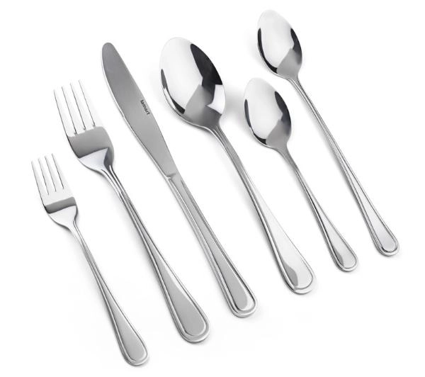 - Wyposażenie: 8 noży obiadowych, 8 widelców obiadowych, 8 łyżek obiadowych, 8 łyżeczek do herbaty, 8 widelczyków deserowych, 8 łyżeczek do latte
