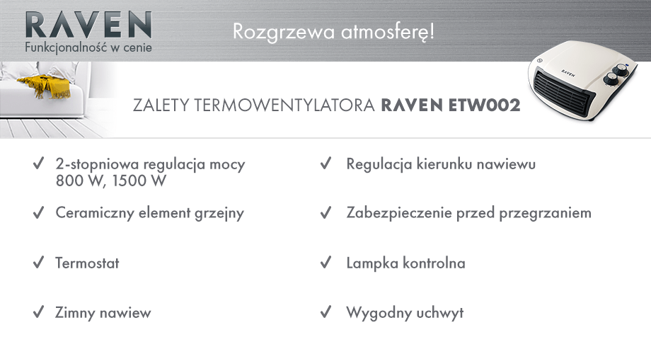 Termowentylator Raven ETW006 2000W Ceramiczny element grzejny Funkcja grzania i chłodzenia