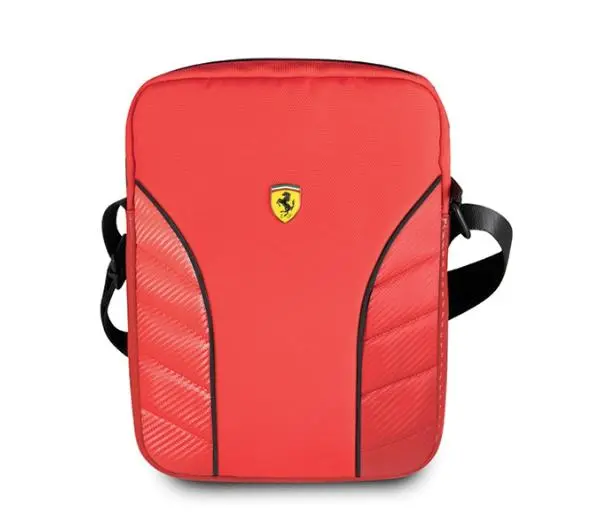Opis urządzenia: Noś swój ulubiony tablet lub smartphone z modą Ferrari. Wysokiej jakości lekka konstrukcja powstała z wodoodpornego nylonu i skóry ekologicznej, torbę można nosić na ramieniu dzięki dopinanemu, regulowanemu paskowi.