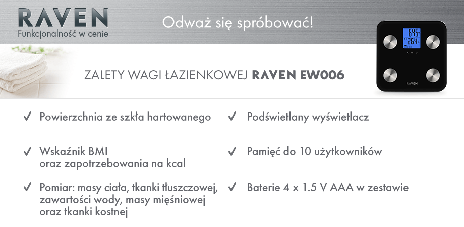 <p> </p><p>Waga łazienkowa z pomiarami RAVEN EW006 to produkt wysokiej jakości. Została wykonana ze szkła hartowanego, dzięki czemu jest wytrzymała i łatwa w czyszczeniu.</p> <ul> <li>Duża, stabilna platforma gwarantuje wygodę i bezpieczeństwo użytkowania.</li> <li>Maksymalne obciążenie wagi to 180 kg!</li> <li>Waga ma w wyposażeniu baterie 4 x AAA 1,5 V, dzięki czemu jest gotowa do użycia zaraz po zakupie.</li> <li>Oprócz pomiaru masy ciała, waga mierzy procentowy udział tkanki tłuszczowej, wody, mięśni i kości w organizmie oraz szacuje wartość dziennego zapotrzebowania energetycznego mierzonego w kilokaloriach.</li> <li>Pamięć ustawień (wzrostu, wieku, płci) dla 10 użytkowników.</li> <li>Dostępne są różne jednostki miary – to możliwość wyboru preferowanej jednostki, np. kg, lb.</li></ul>