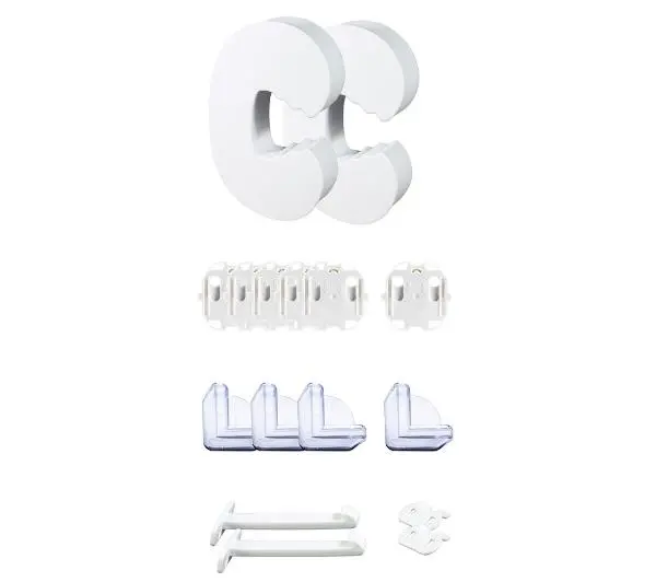 W zestawie: zabezpieczenie do szafki, zabezpieczenie do szuflad, zatyczka do gniazda, zabezpieczenie narożników, zabezpieczenie drzwi