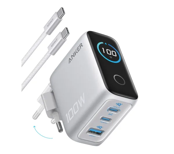 : Anker Charger (100W, 3 Ports, Smart Display) – ładowarka GaN z trzema portami i inteligentnym wyświetlaczem pokazującym w czasie rzeczywistym status ładowania, temperaturę i pracę portów, wyposażona w składany wtyk i przewód USB-C w zestawie.