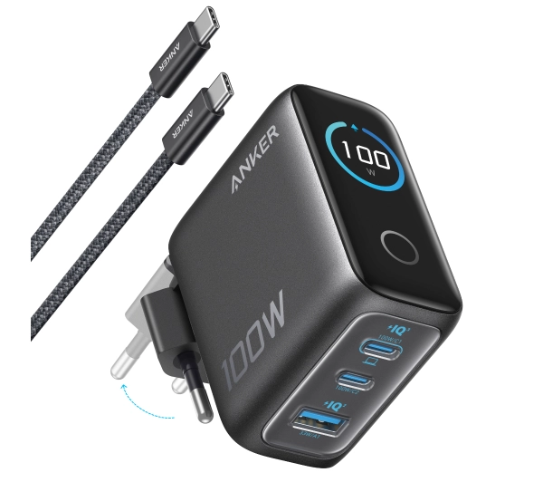 : Anker Charger (100W, 3 Ports, Smart Display) – ładowarka GaN z trzema portami i inteligentnym wyświetlaczem pokazującym w czasie rzeczywistym status ładowania, temperaturę i pracę portów, wyposażona w składany wtyk i przewód USB-C w zestawie.