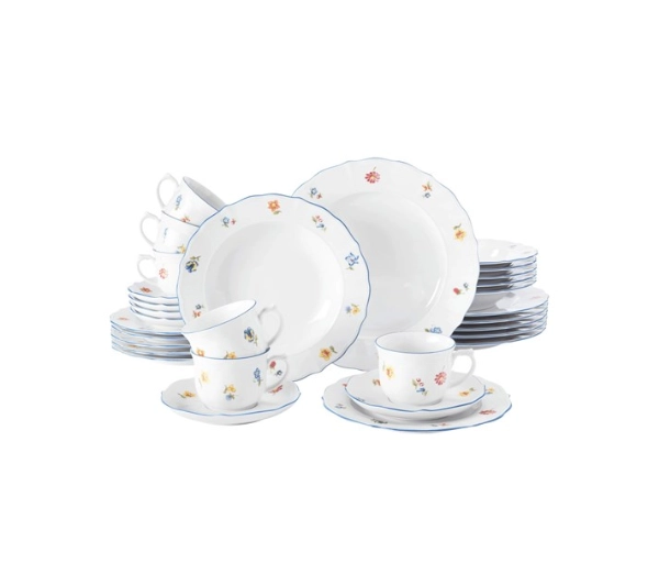 Zawartość: 6 x spodek, 6 x filiżanka, 6 x talerz obiadowy, 6 x talerz do zupy, 6 x talerz śniadaniowy